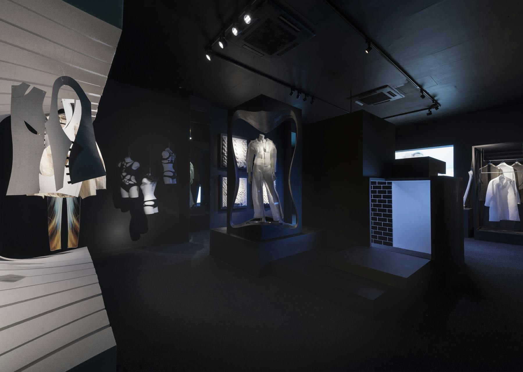 While many of the artists knew or had worked with the late Zaha Hadid, it is the philosophy of radical experimentation and innovative design associated with her that curator Lou Stoppard had in mind when selecting the 9 contributors. Rather than futuristic, Stoppard was looking for “purely speculative” pieces – those that asked questions of our future expectations of fashion and tech, rather than provided blueprints. And the disorientating world I experienced on walking into Maison Mais Non is proof that he found exactly what he was after.